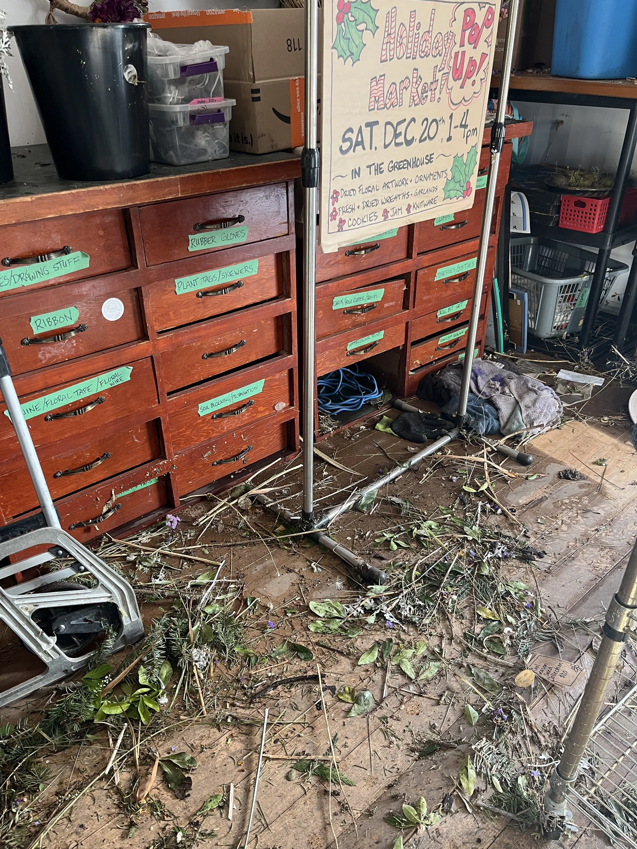 I literally watched all of my ideas, projects, supplies and plans (and the actual floor itself!) float to the surface of the 2 feet of flood water that filled my studio and yard. Bouquet wraps, boxes of dried flowers, tools, plant pots, beeswax for some project (which I obviously rescued lol), stickers, bungee cords, fertilizer….the list could go on forever.
